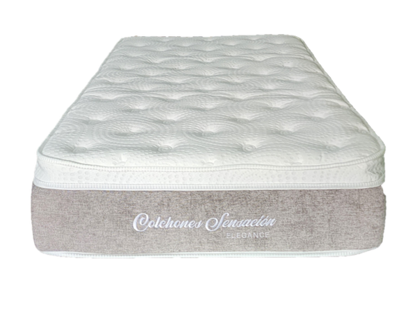 El modelo ELEGANCE de la marca Sensación es una pieza sin resortes que cuenta con un soporte de laminado de alta densidad y doble colchoneta de hule espuma suave. Su estructura minimaza la sensación de movimiento.